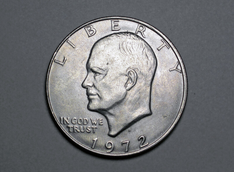 Frank Gasparro designed the Eisenhower dollar, released in 1971 as the first dollar-sized coin in the US since the Peace dollar ended in 1935. The reverse borrows the Apollo 11 mission insignia; subtle variations in how Earth appears created the collectible Type 1, 2, and 3 varieties of the 1972. Silver versions were struck at San Francisco from 1971 to 1976. The 1976 Bicentennial issue uses Dennis R. Williams' Independence Hall design on the reverse. The coin never caught on in commerce - vending machines wouldn't take it, and the public mostly left them in drawers.