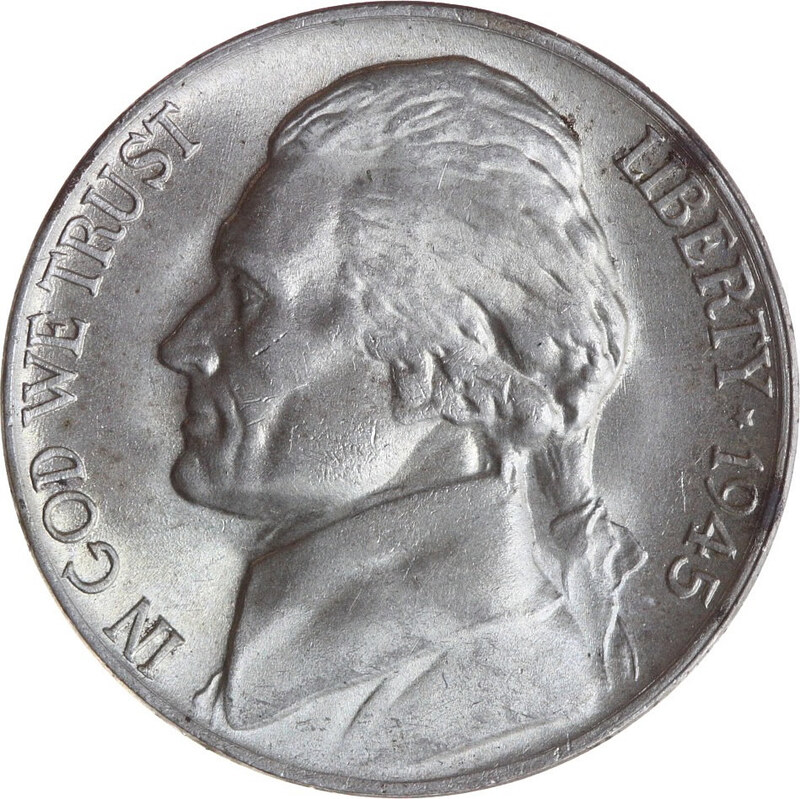 Felix Schlag won a public competition in 1938 to design the Jefferson nickel, which replaced the Buffalo nickel. His initials weren't added to the obverse until 1966, nearly three decades in. The "wartime" nickels from 1942 to 1945 were struck in 56% copper, 35% silver, and 9% manganese to save nickel for war production; a large mintmark on the reverse identifies them. The 1950-D had a low mintage and was heavily hoarded. The Westward Journey designs in 2004 and 2005 were the first major reverse change in 66 years; a new portrait and reverse followed in 2006.